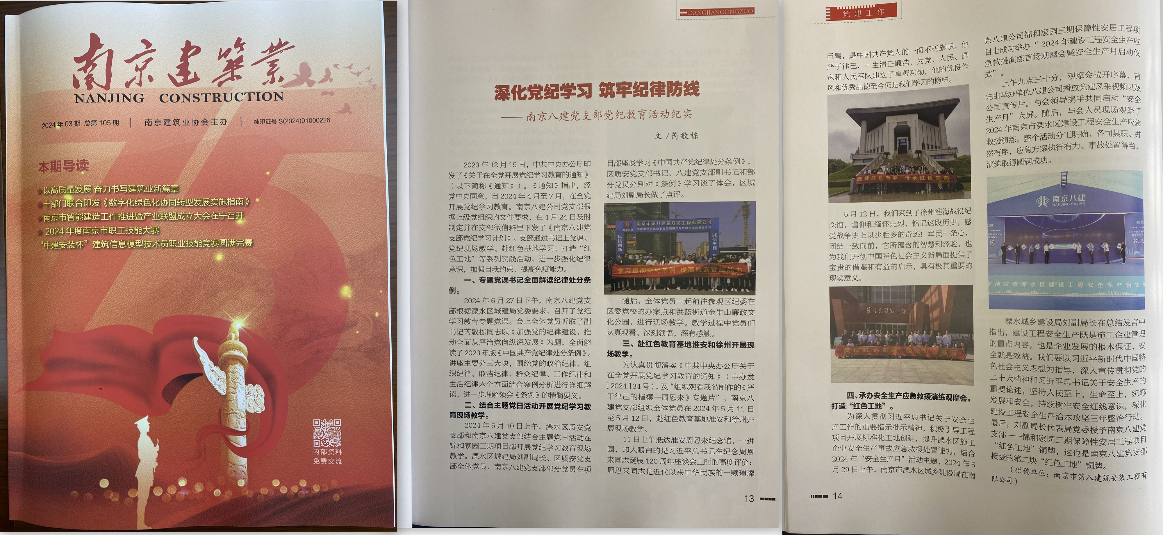 2024年9月,南京建筑業(yè)協(xié)會主辦的《南京建筑業(yè)》(第105期)刊登了芮敬棟同志《深化黨紀(jì)學(xué)習(xí) 筑牢紀(jì)律防線——南京八建黨支部黨紀(jì)教育活動紀(jì)實》一文 -